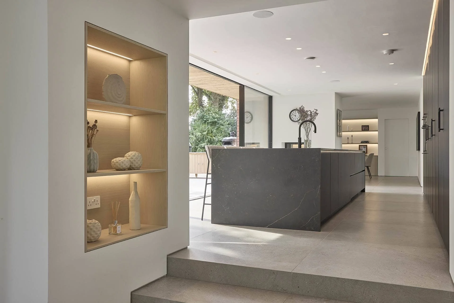 The first thing to think about is how the room will be used. Most kitchens need a mix of task lighting for prep areas and softer lighting for the evening, especially in open-plan spaces. Sam helps clients think that through as part of the overall design.