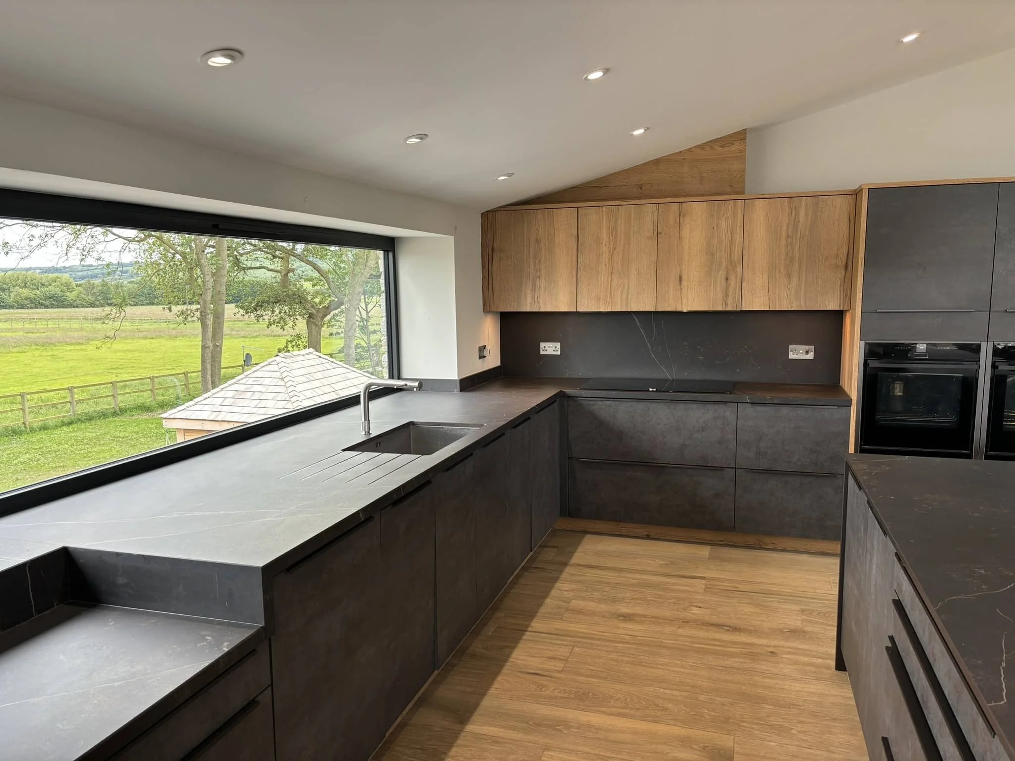 The worktops are Dekton throughout, running continuously across both zones and extending into the windowsill on one run. Fitting Dekton to this depth (considerably deeper than a standard worktop to reach the window) requires precise templating and careful installation, but the result is a continuous surface that reinforces the architectural quality of the space. Appliances are Neff throughout. The Quooker Front tap is fitted at the main sink; a matching conventional tap in a similar design was sourced for the lower accessible sink, so the two positions feel visually consistent.