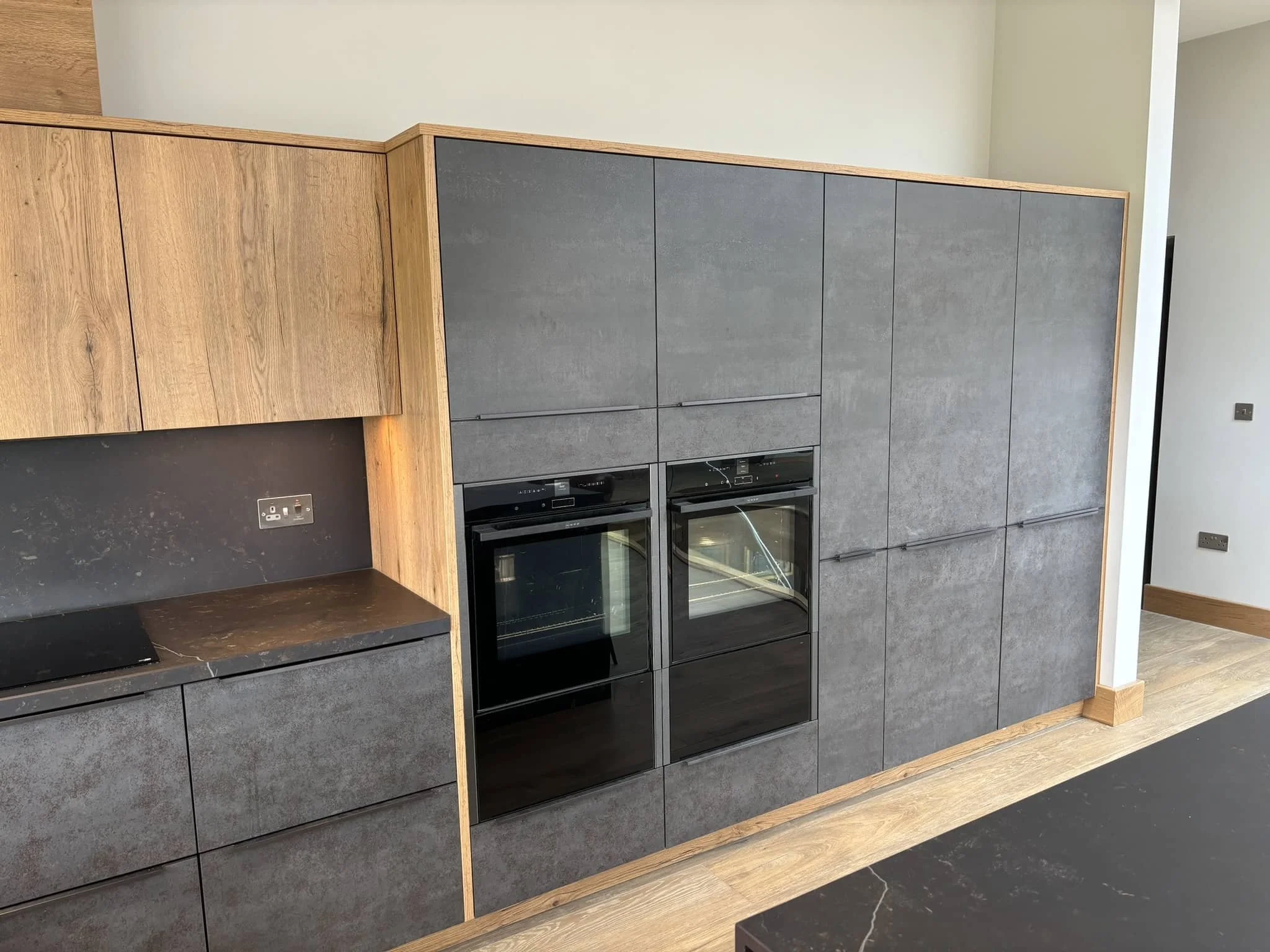 The kitchen resolves the accessibility requirements through two clearly differentiated zones in the same continuous space. The standard-height zone includes a hob beneath the oak wall units, a sink and the main prep area at conventional working height, used primarily by the client’s wife. The ovens are positioned at a height that works for both of them: high enough for comfortable use standing, accessible enough from a seated position in a wheelchair. Slide & Hide ovens with shelves on extending rails enabled him better access to the ovens.