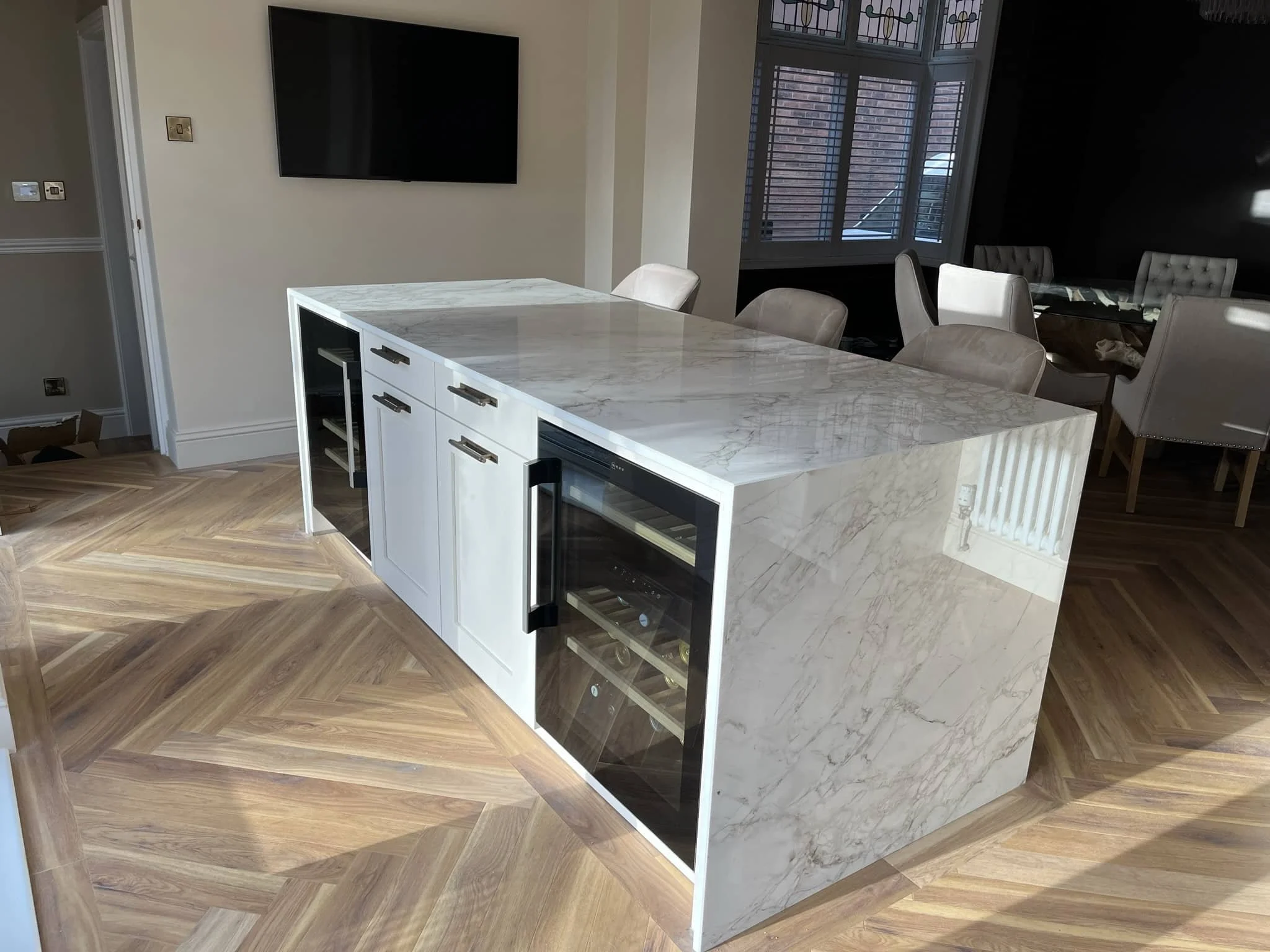 The Häcker Hampton painted timber shaker door, Dekton Bergen worktops, antique bronze handles and splashback give the kitchen warmth and traditional character, while the island with its twin wine coolers and waterfall ends brings a considered, generous quality to the centre of the room.