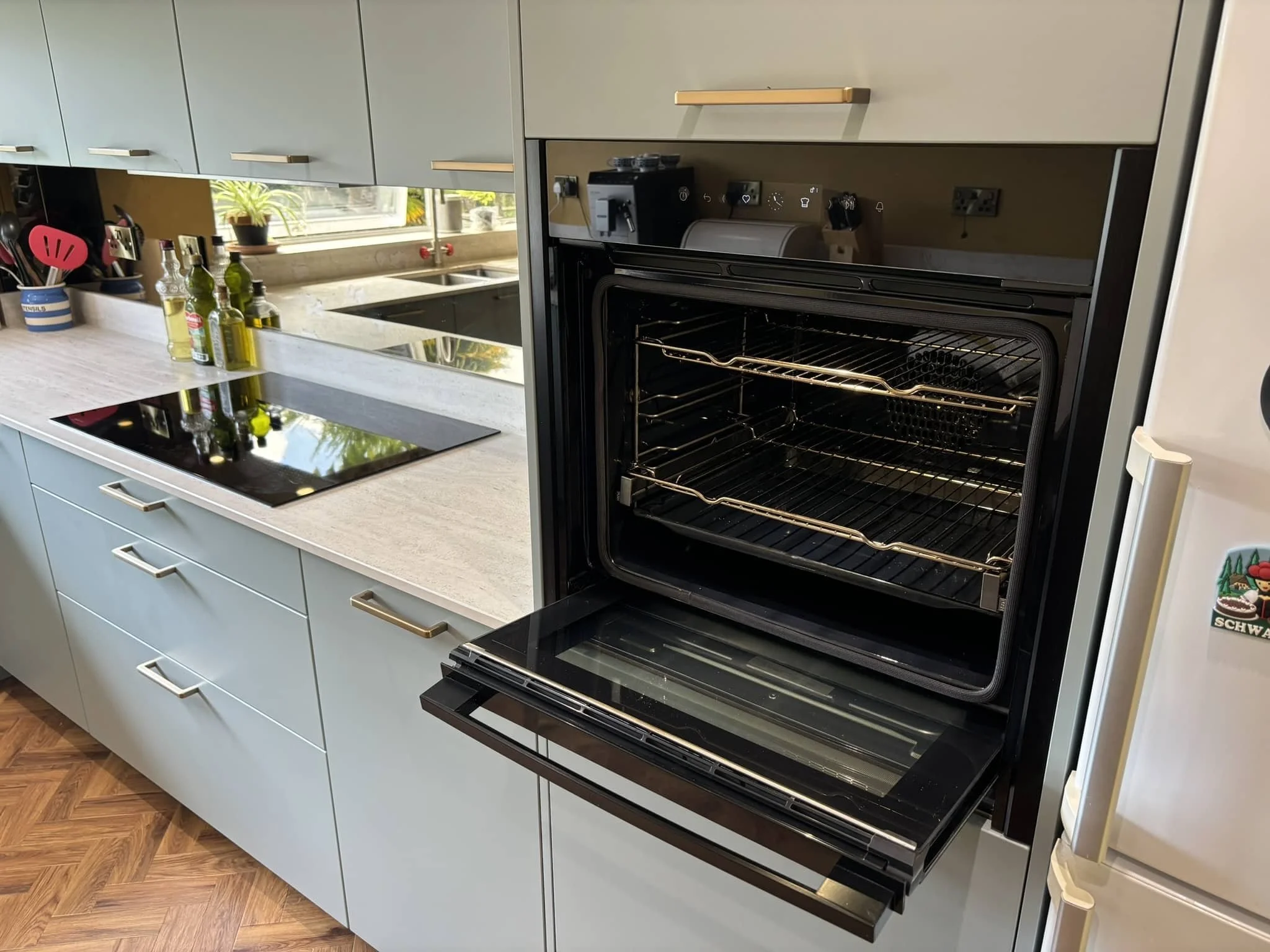 The Häcker Porto cabinetry in eucalyptus green, the Dekton travertine-look worktops, the antique bronze mirror splashback and the warm LVT flooring all work together to create a kitchen that feels calm and unique. It is not large or complicated. It is just done well.