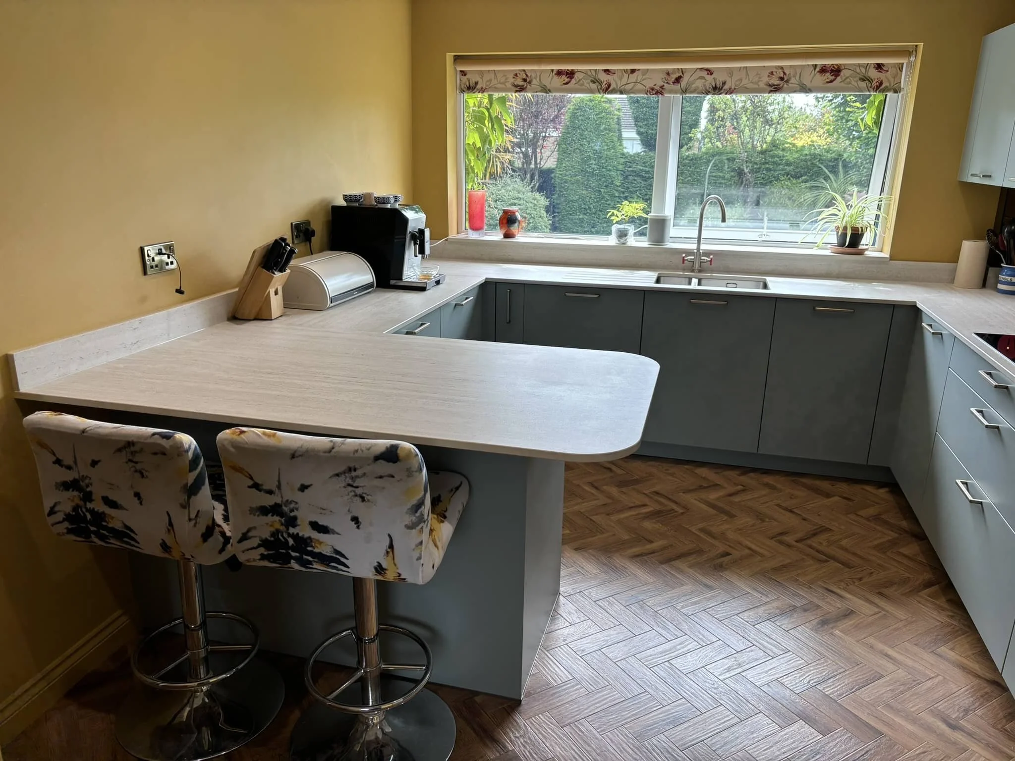 The peninsula breakfast bar sits at one end, where the clients can eat breakfast and look out of the window: a practical, well-positioned social space that works just as well as a much larger island, perfect for a room of this size. The retained freestanding fridge was worked into the design with a bespoke cubby unit built above it, so it reads as part of the kitchen rather than something left over.