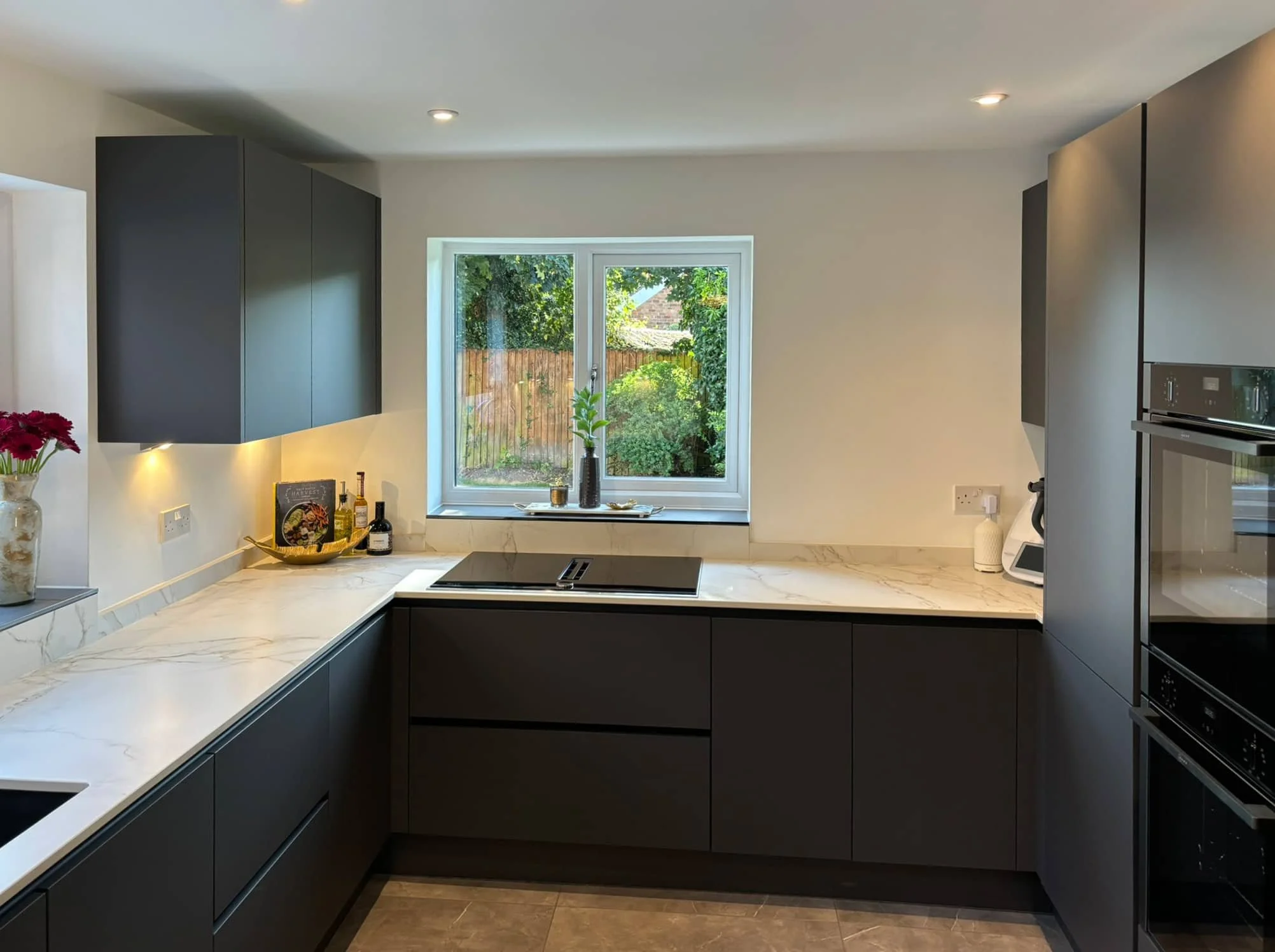 The cabinetry is Häcker Top Soft Graphite, a matte handleless range with a strong finish that suits a kitchen of this scale. The worktops are Dekton, specified with drainer grooves cut directly into the surface alongside the sink. It is worth noting that drainer grooves in Dekton are technically possible and were chosen specifically by this client, though they are not something Samuel Neal specifies often: the practical performance of drainer grooves rarely matches the visual appeal, and most clients find a well-chosen sink and worktop combination works better without them.