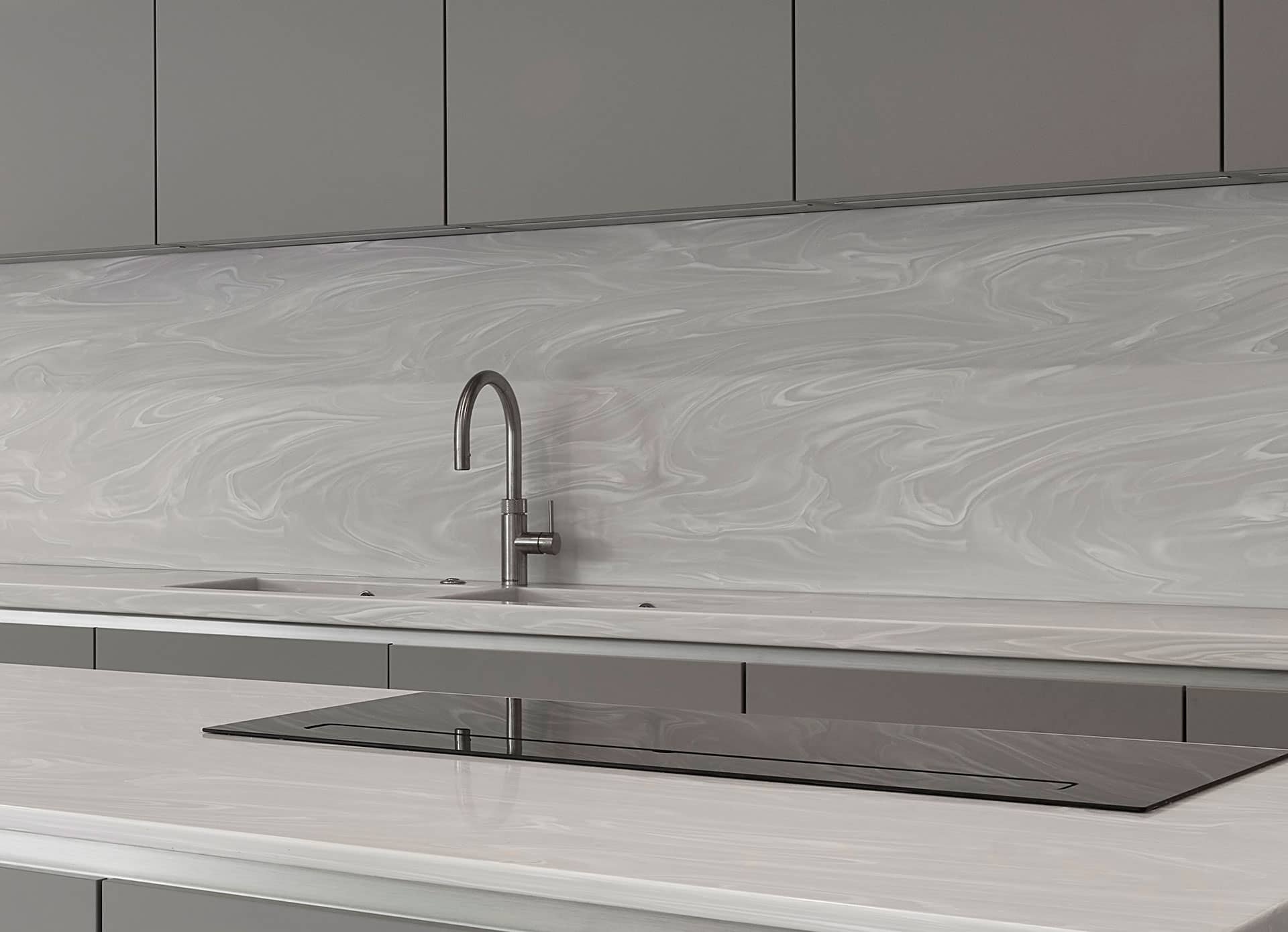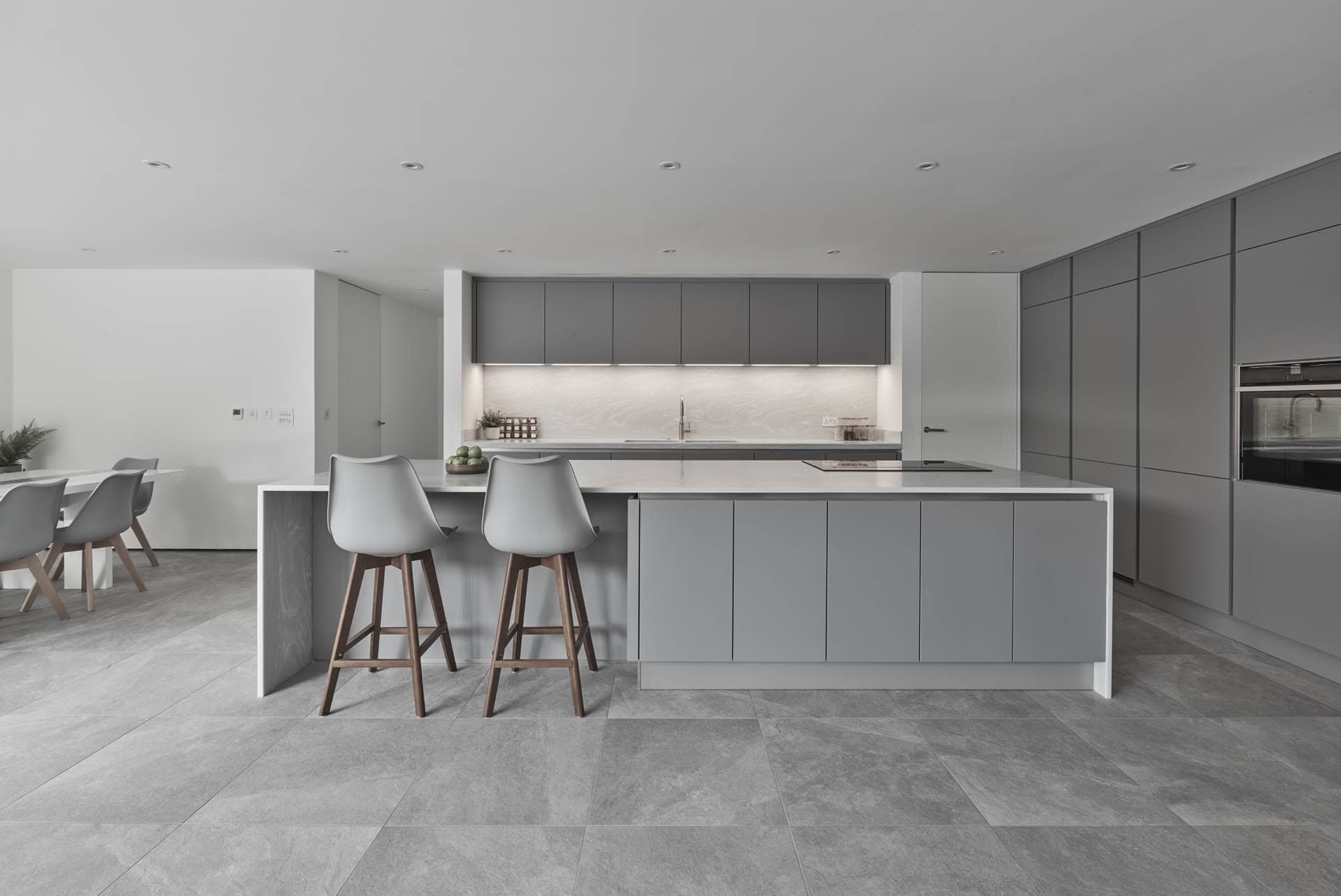 The cabinetry is Häcker in a Pearl Grey finish (Top Soft Pearl Grey), with true handleless doors giving the kitchen its clean, unbroken lines. The worktop specification for the island was Corian Grey Onyx in a white and grey-veined colour, chosen specifically because of the island’s size. At 3.7 metres, any other worktop material would have required a visible join. Corian can be thermoformed and jointed seamlessly at that scale, and the waterfall gables to both ends of the island could be mitered cleanly without compromise. It was the practical answer to a practical problem, and it reads as the most visually resolved element of the room.