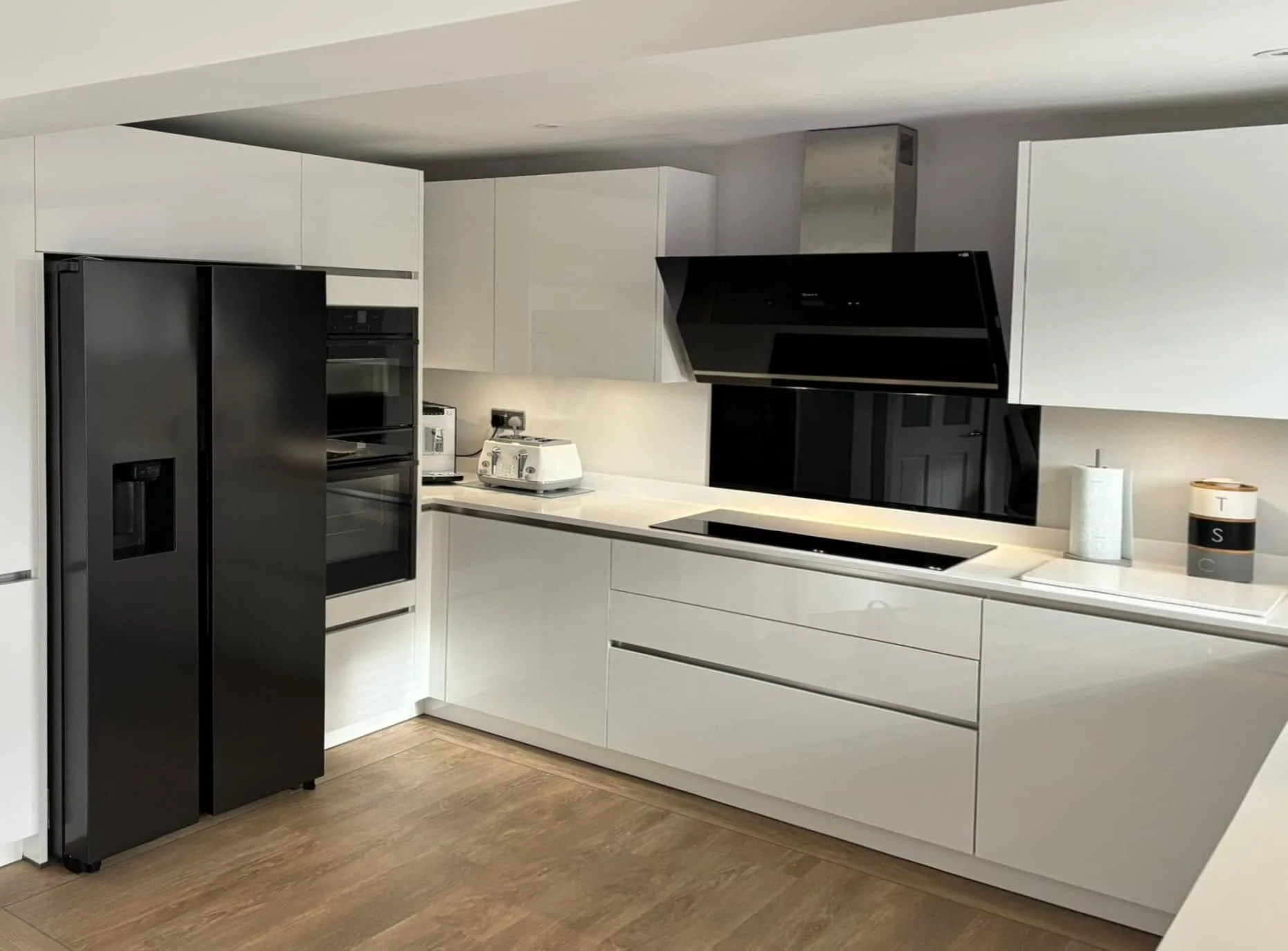 What started as a cramped and disconnected layout in a two-bedroom semi has become a bright, open kitchen and dining space that feels considerably larger than the footprint suggests. The white gloss cabinetry, composite worktops and glass splashback keep everything clean and consistent, while the layout does the real work of putting everything in the right place.
